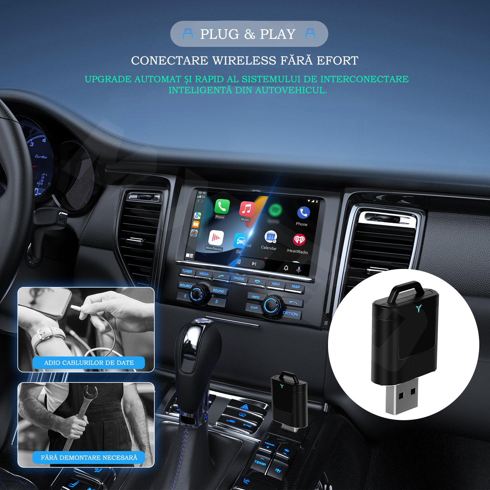 Transforma CarPlay sau Android Auto cu fir in conexiune wireless instant – compatibil atat cu iOS, cat si cu Android, fara cabluri, fara batai de cap.
