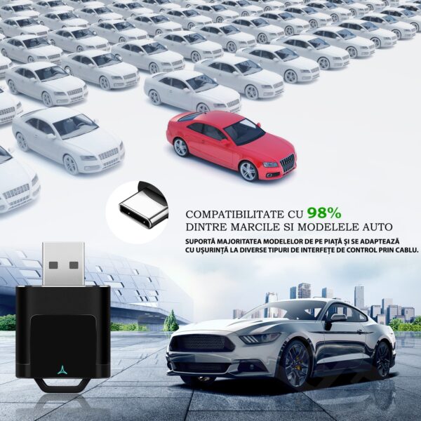 Compatibilitate extinsa – Functioneaza cu 98% dintre marcile si modelele auto, ideal pentru cei fara CarPlay sau Android Auto wireless din fabrica.