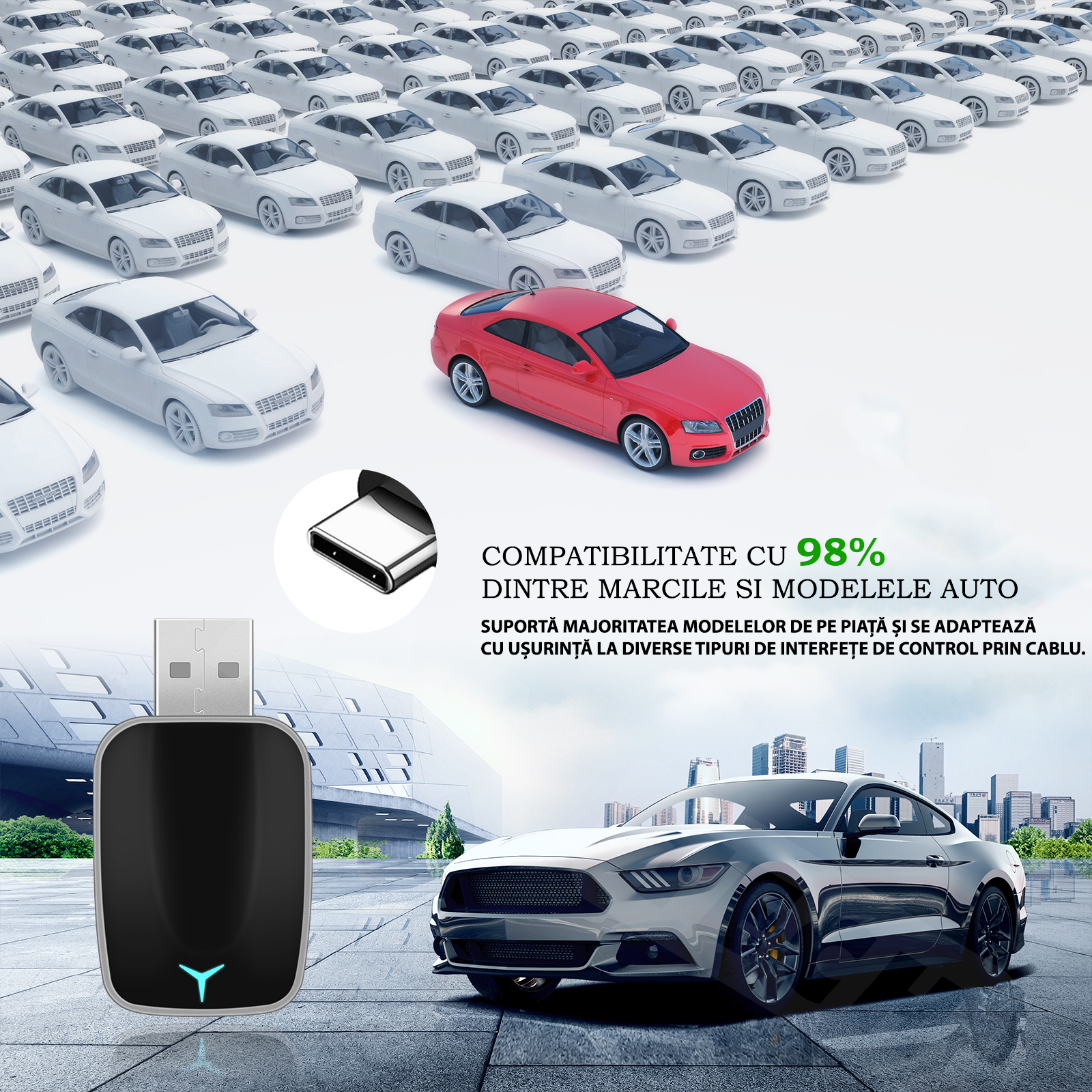 Compatibilitate extinsa – Functioneaza cu 98% dintre marcile si modelele auto, ideal pentru cei fara CarPlay sau Android Auto wireless din fabrica.