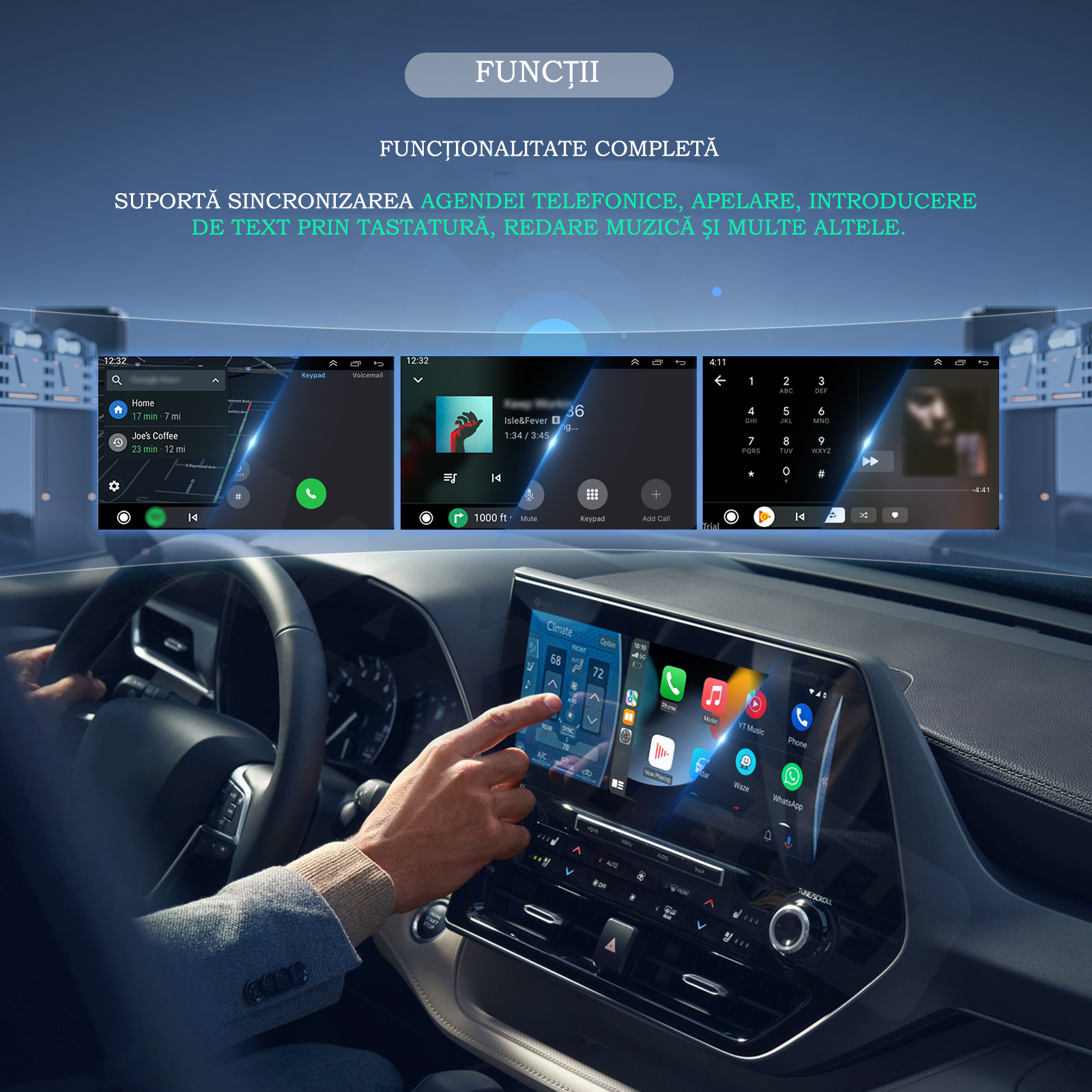 Functionalitate completa: apeluri, agenda, muzica, tastatura si multe altele – totul integrat perfect pe ecranul masinii.