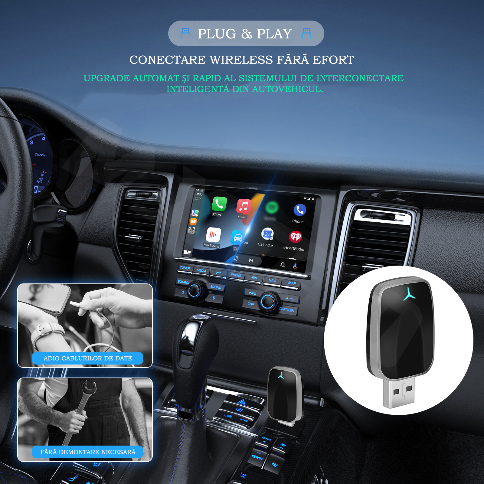Transforma CarPlay sau Android Auto cu fir in conexiune wireless instant – compatibil atat cu iOS, cat si cu Android, fara cabluri, fara batai de cap.