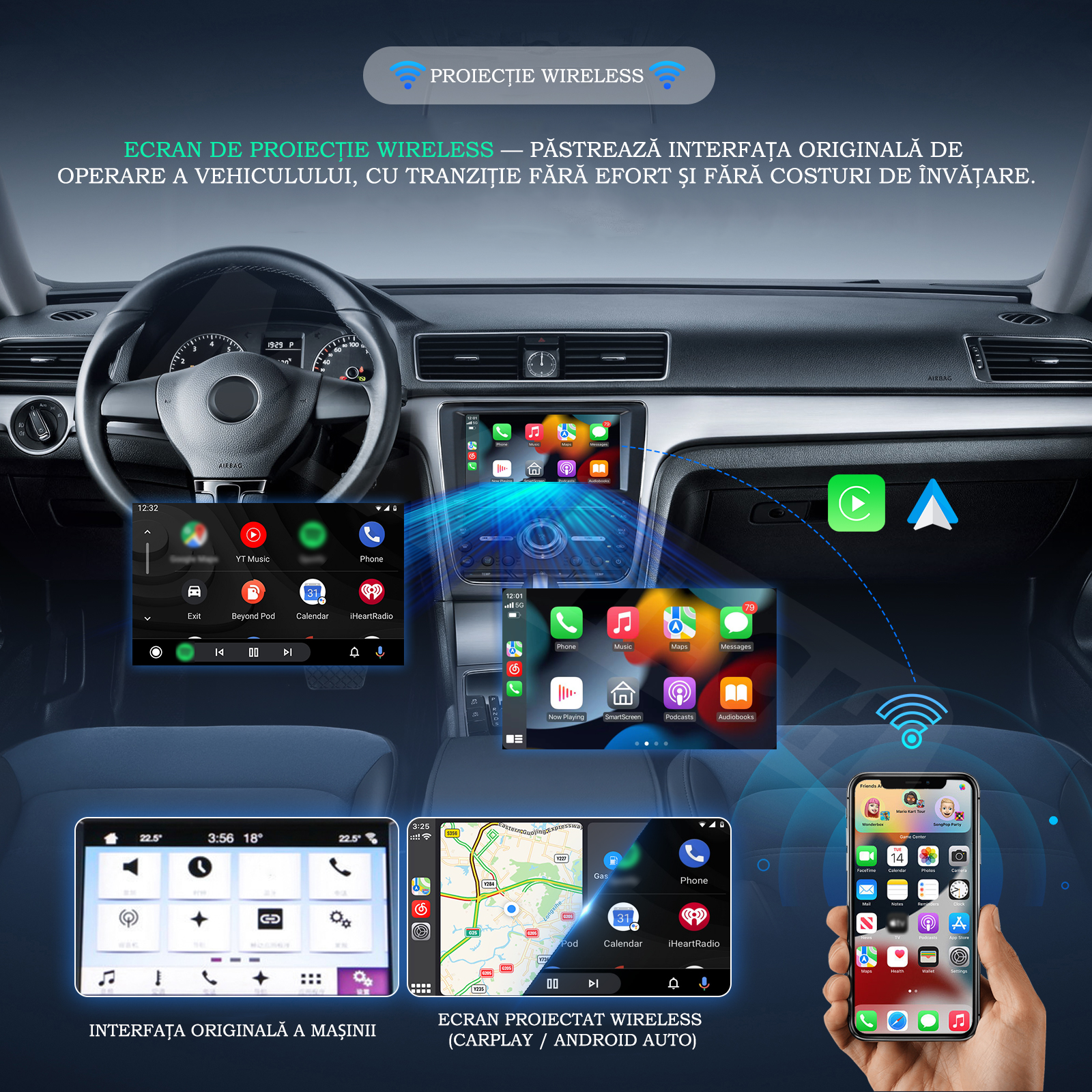 Proiectie wireless fluida – Reda interfata originala CarPlay/Android Auto direct pe ecranul masinii.