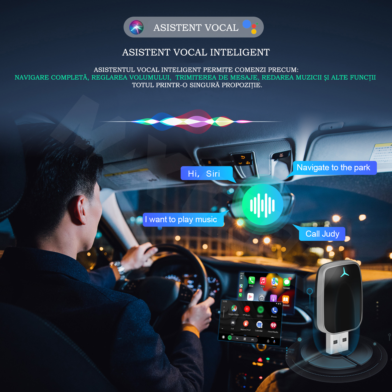 Control vocal inteligent prin Siri sau Google Assistant – reda muzica, navigheaza, trimite mesaje sau apeleaza fara sa ridici mainile de pe volan.