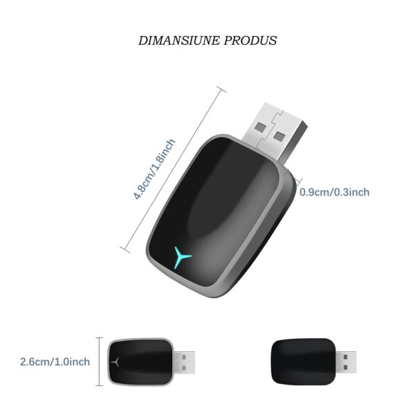 Atentie: Adaptorul functioneaza doar pe masini cu CarPlay sau Android Auto prin cablu. Nu adauga functia, ci transforma conexiunea pe fir in wireless (Wi-Fi).
