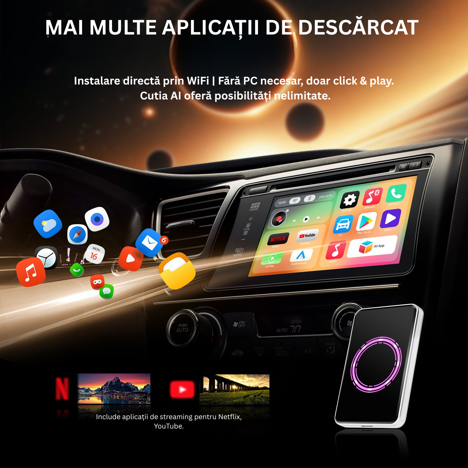 Dispozitivul transforma sistemul auto original intr-o platforma inteligenta cu Android 12, CarPlay wireless, Android Auto, AirPlay si multe alte functii moderne. Se conecteaza plug & play la masinile care au CarPlay original cu fir activ si nu necesita modificari sau cabluri suplimentare. Este ideal pentru cei care vor o experienta multimedia completa direct pe ecranul masinii, cu acces la aplicatii, streaming, navigatie si control vocal.