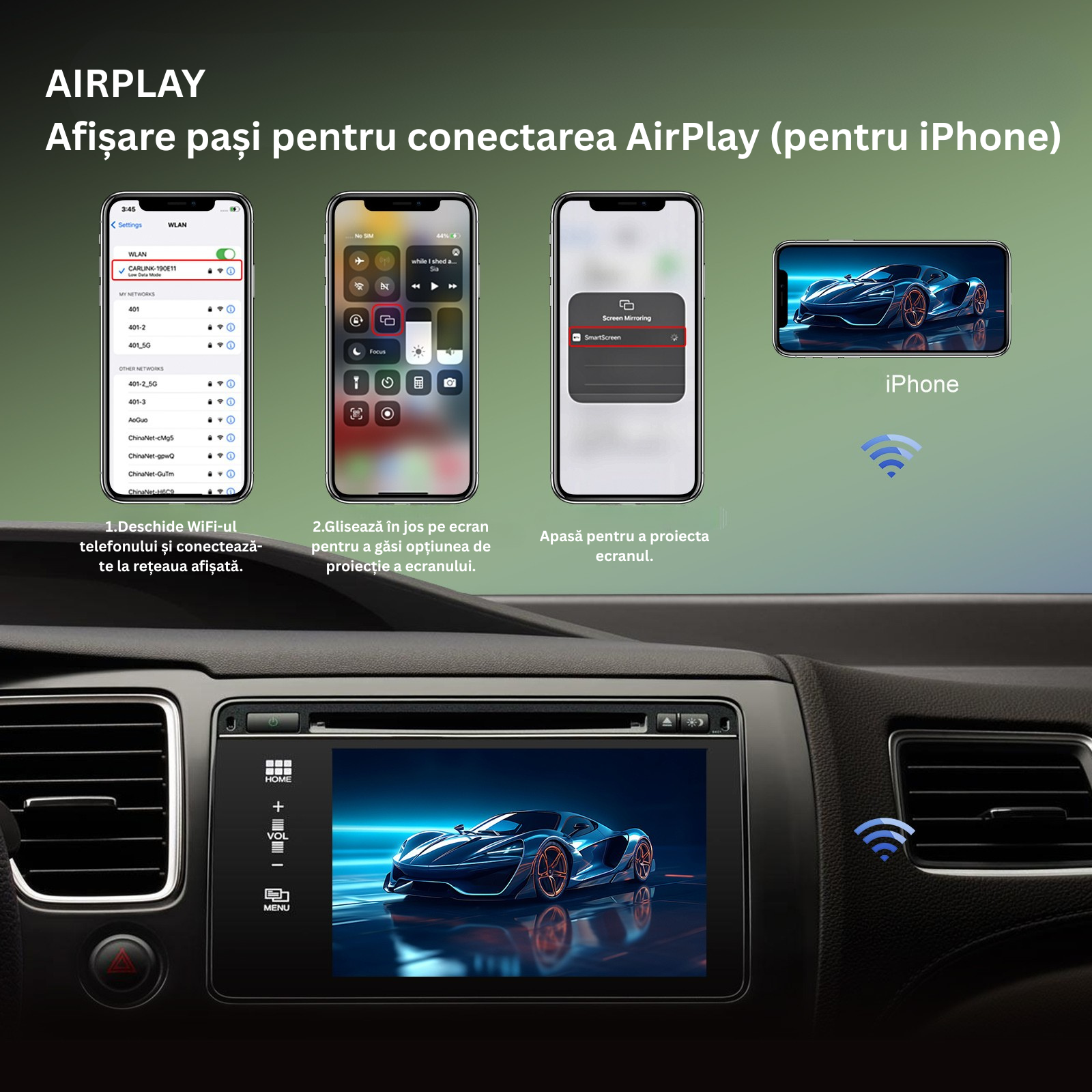 ⚠️ Nota: Masina trebuie sa aiba CarPlay cu fir activ din fabrica pentru ca dispozitivul sa functioneze corect.