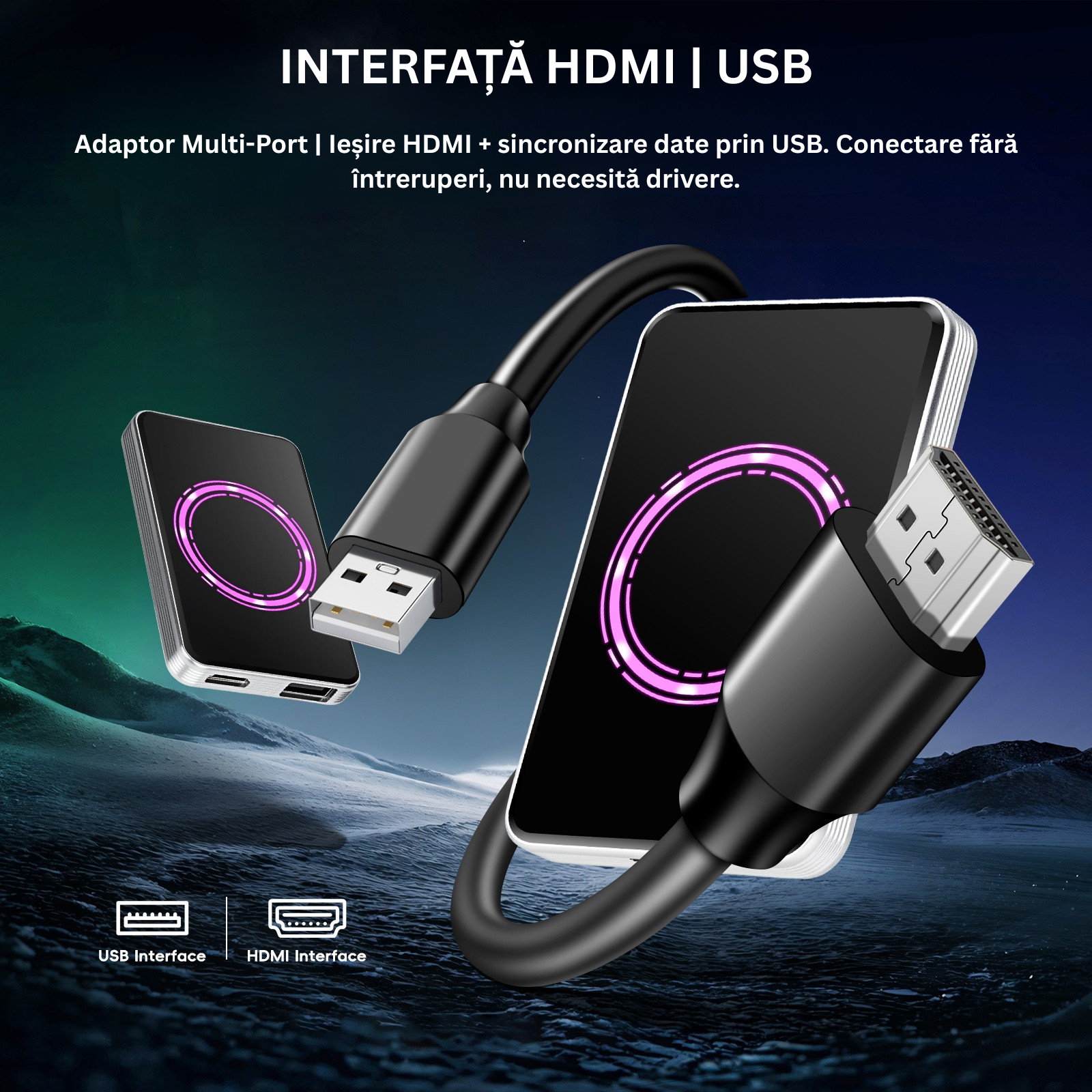Interfata HDMI si USB – Iesire video pentru TV/monitor si conectare rapida prin USB, fara drivere.