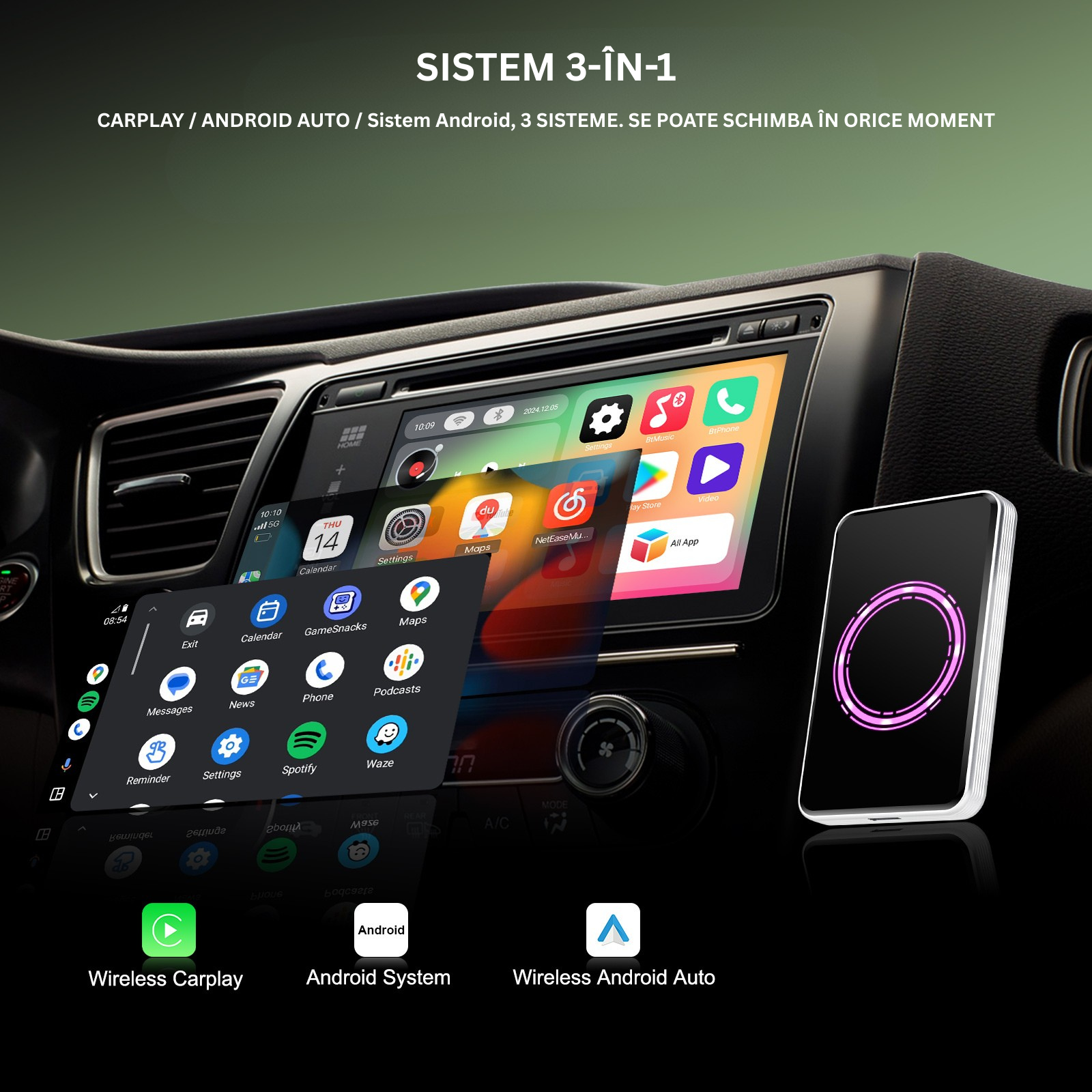 3-in-1: Android, CarPlay si Android Auto – Comutare rapida intre cele trei sisteme fara cabluri, direct pe ecranul masinii.