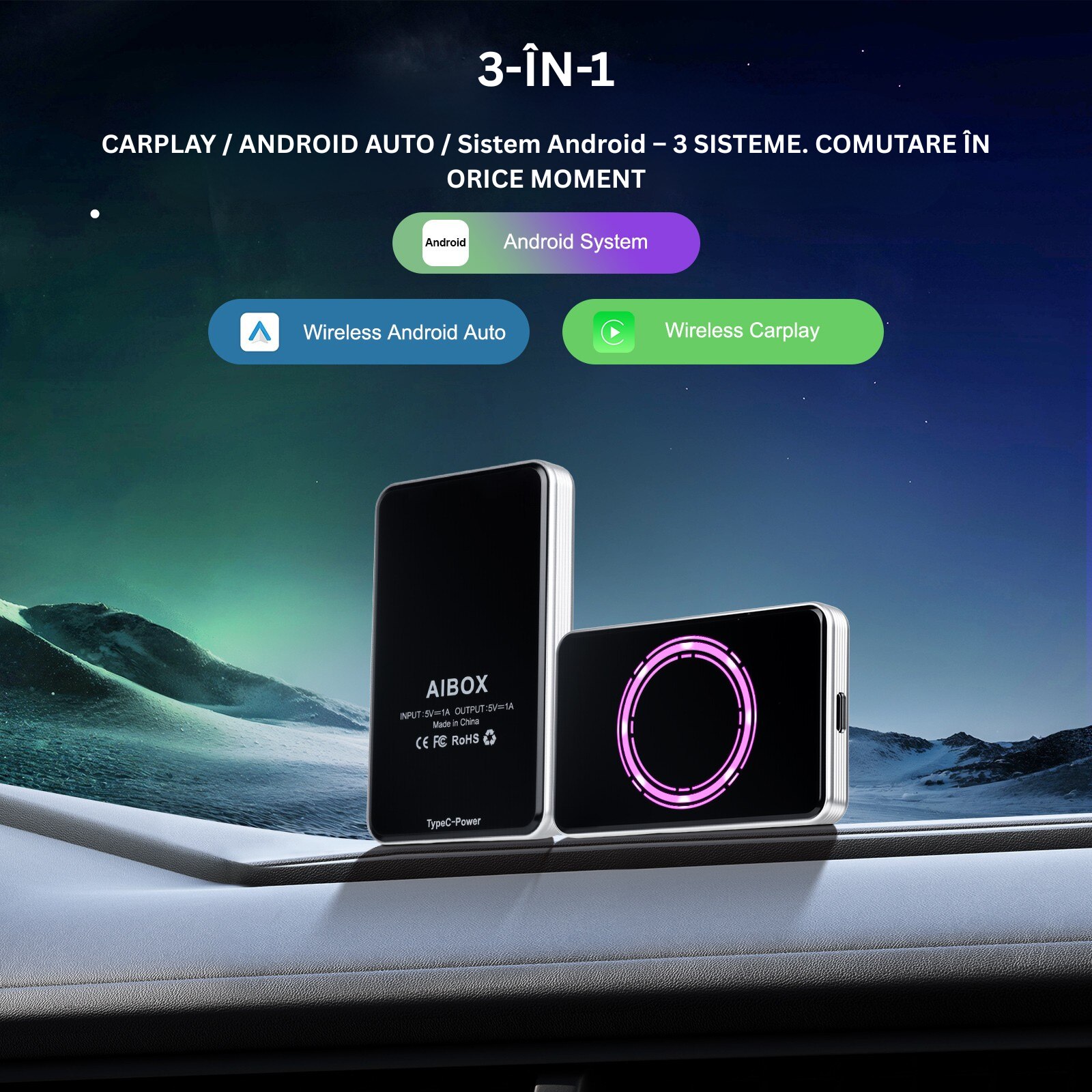 HomeShopAi boxAI Box Wireless Auto 3 in 1, Android 12 cu CarPlay & Android Auto, MaxTech®, HDMI 4K, 4GB RAM + 32GB Memorie, Cip Qualcomm de 2GHz, Bluetooth 5.0, AirPlay, RGB, Compatibilitate Universala