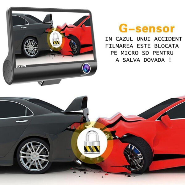 De asemenea, iti vei putea lasa autoturismul in parcare, iar daca va fi lovit sau vandalizat cat esti plecat este posibil ca Camera tripla auto de bord Full HD 1080P sa capteze ce s-a intamplat datorita tehnologiei G-Sensor