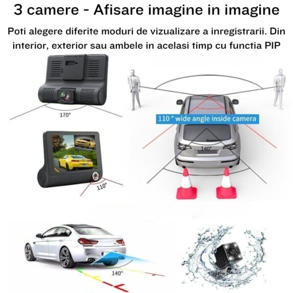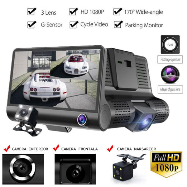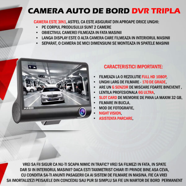 Camera tripla auto de bord Full HD 1080P se potriveste in orice autoturism si iti ofera linistea de care ai nevoie pentru a conduce relaxat.