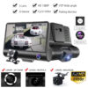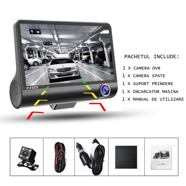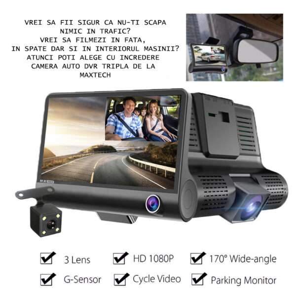 Camera auto de bord DVR Tripla Fata, Spate, Interior, MaxTech®, Ecran IPS de 4.0 inch, FULL-HD 1080p, Unghi 170 grade, Detectarea Miscarii, G-senzor, Night Vision, Asistenta parcare, Microfon integrat, Functie playback, Filmare in bucla, Slot Card