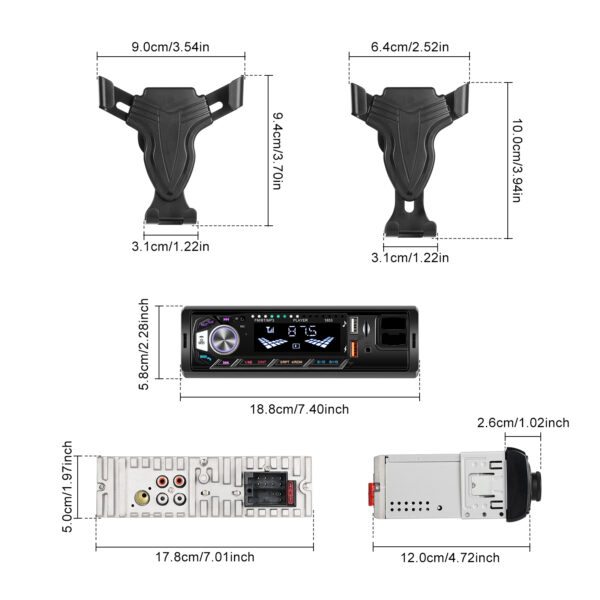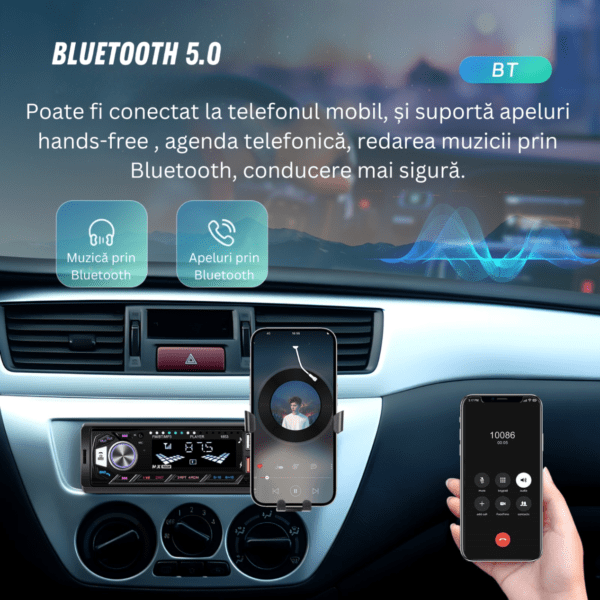 Casetofon auto mp3 Player cu suport telefon detasabil MaxTech®, Model nou, Bluetooth 5.0, USB, CardSD, Auxiliar, RCA, Radio FM, Incarcare rapida, Handsfree, 7 culori