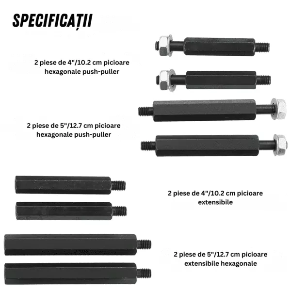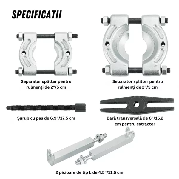 2. Kit complet: Setul include un cleste de separare a rulmentilor de 3 inch (7,6 cm), un cleste de separare de 2 inch (5 cm), un yoke de 6 inch (15,2 cm), un surub de fortare de 6-1/4 inch (15,9 cm), patru suruburi de extensie de 4 inch (10 cm), patru suruburi de extensie de 5 inch (12,7 cm) si doua picioare L de 4-1/2 inch (11,4 cm).