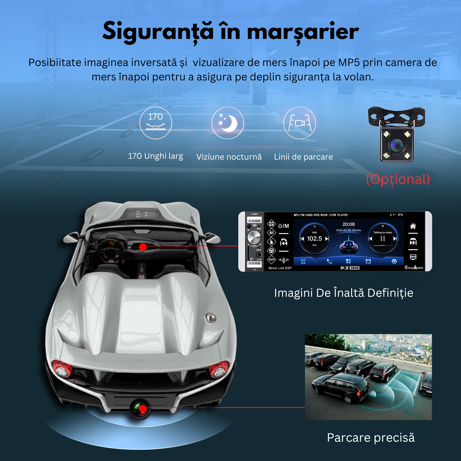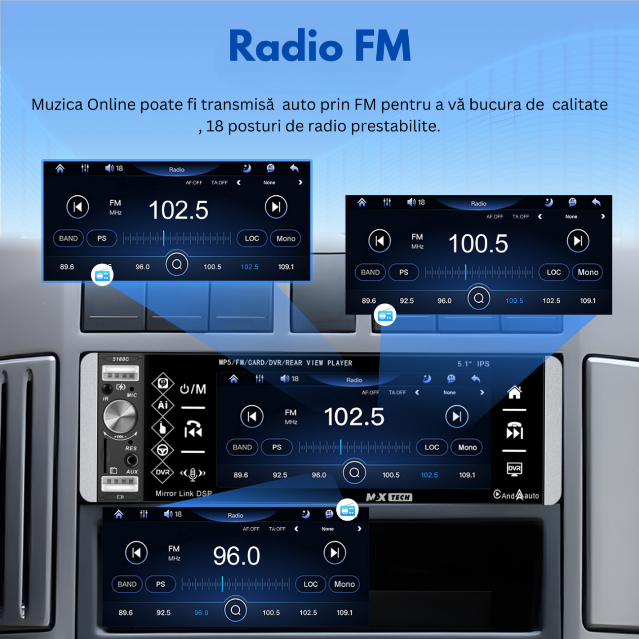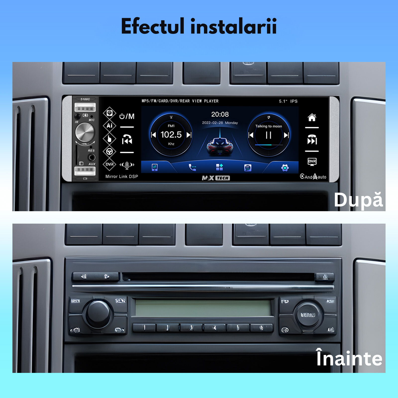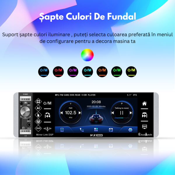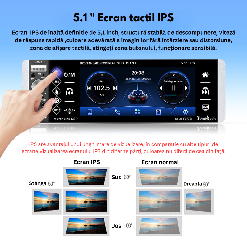 Transforma-ti experienta de condus cu noul sistem stereo auto MaxTech® de 5.1 inch, un player 1 DIN multifunctional care integreaza tehnologie de varf si conectivitate avansata. Acest sistem este perfect pentru cei care doresc sa aduca functionalitati moderne in vehiculul lor, indiferent de varsta acestuia.