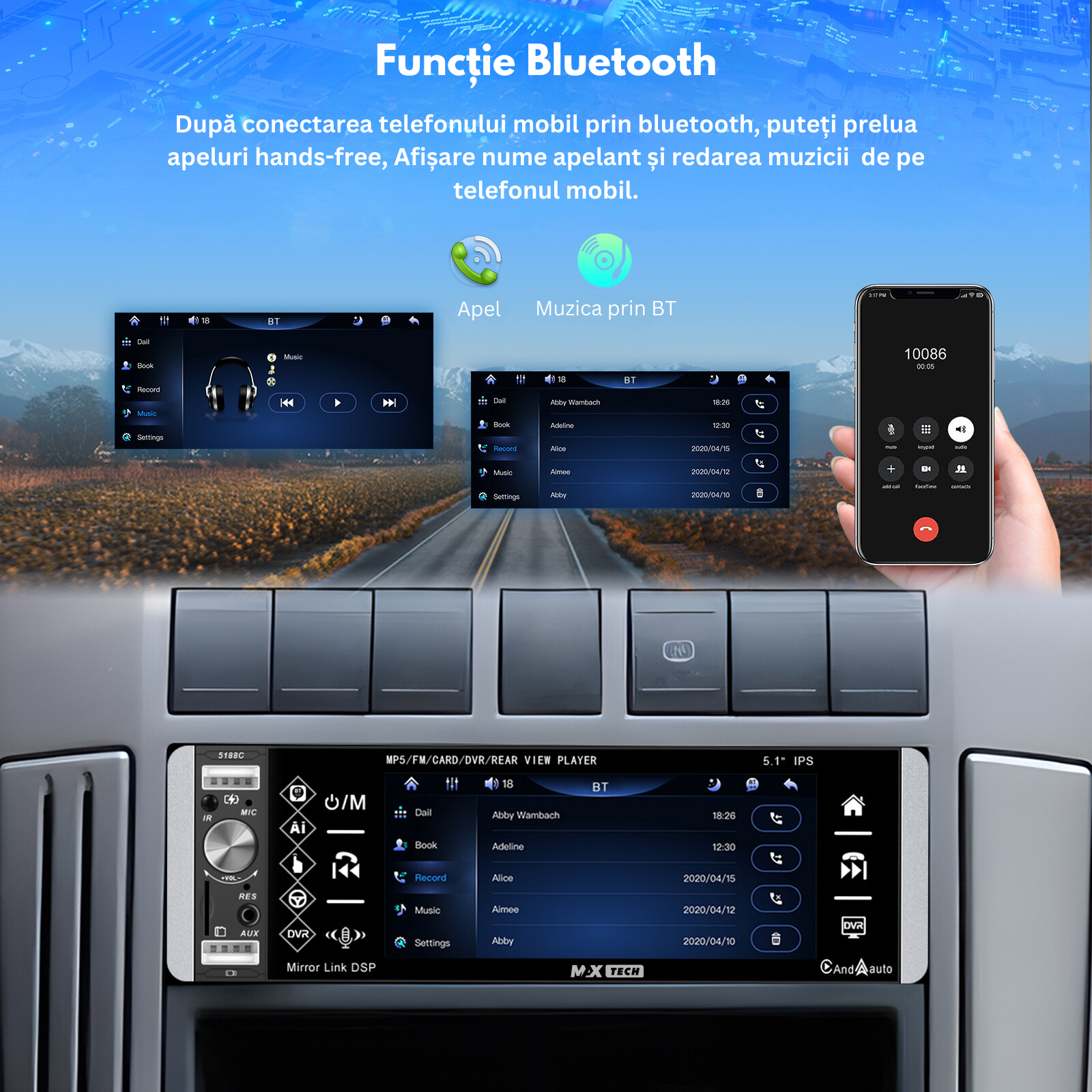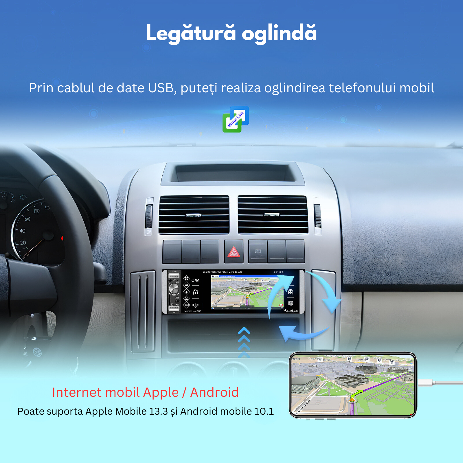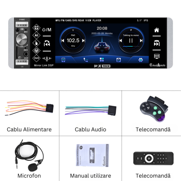 - Acces la aplicatii: Permite utilizarea aplicatiilor de pe telefon direct pe ecranul MP5 playerului, cum ar fi navigatia, muzica sau mesageria.