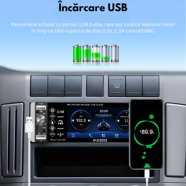 - Un port USB multifunctional reduce numarul de cabluri si adaptoare necesare, simplificand procesul de incarcare si transfer de fisiere intre diferite dispozitive. Poti folosi acelasi cablu atat pentru a incarca MP5 player-ul, cat si pentru a transfera date sau a incarca telefonul.