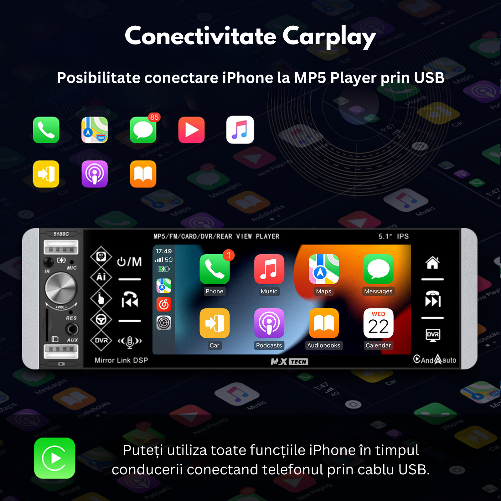 MP5 Player universal Carplay si Android auto 1 Din, MaxTech®, display HD de 5.1 inch, Aux, Card SD, USB Frontal, HandsFree, Bluetooth, Subwoofer, Comenzi volan, Radio, Egalizator DSP, Microfon inclus