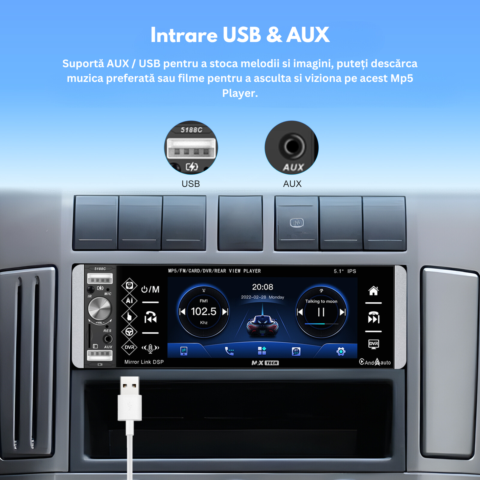 Un MP5 player cu multiple optiuni de conectivitate, precum intrare auxiliara, slot pentru card SD si port USB pentru transfer de informatii si incarcare a telefonului, ofera o serie de beneficii utile:
