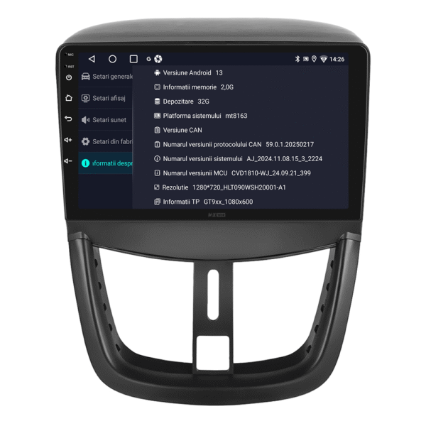 Sistemul include radio RDS cu afisare post si melodie, comutare automata pe frecventa cea mai buna si procesare audio DSP cu egalizator si filtru activ pentru sunet clar, echilibrat si personalizabil.
