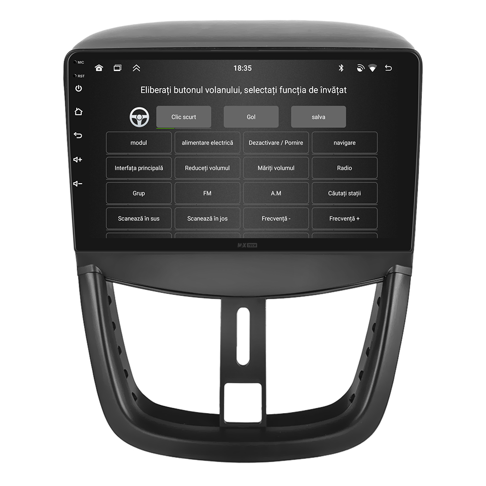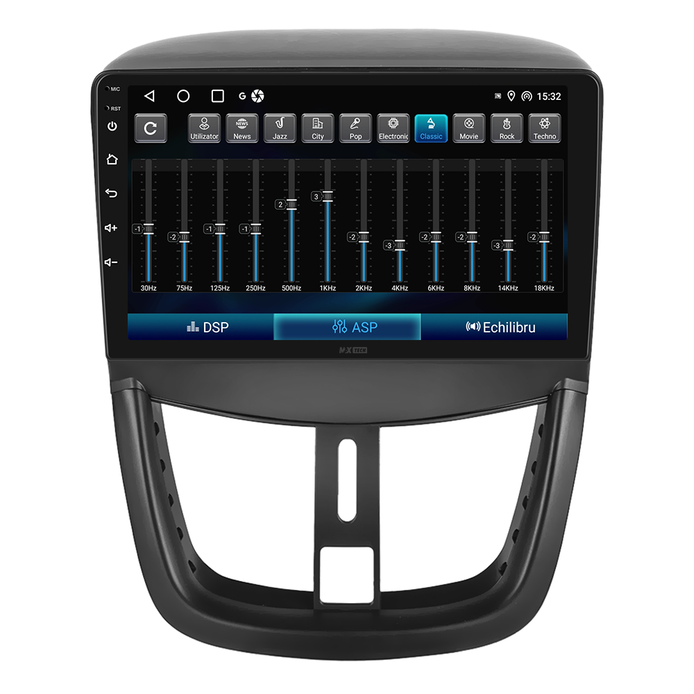 Sistemul include radio RDS cu afisare post si melodie, comutare automata pe frecventa cea mai buna si procesare audio DSP cu egalizator si filtru activ pentru sunet clar, echilibrat si personalizabil.