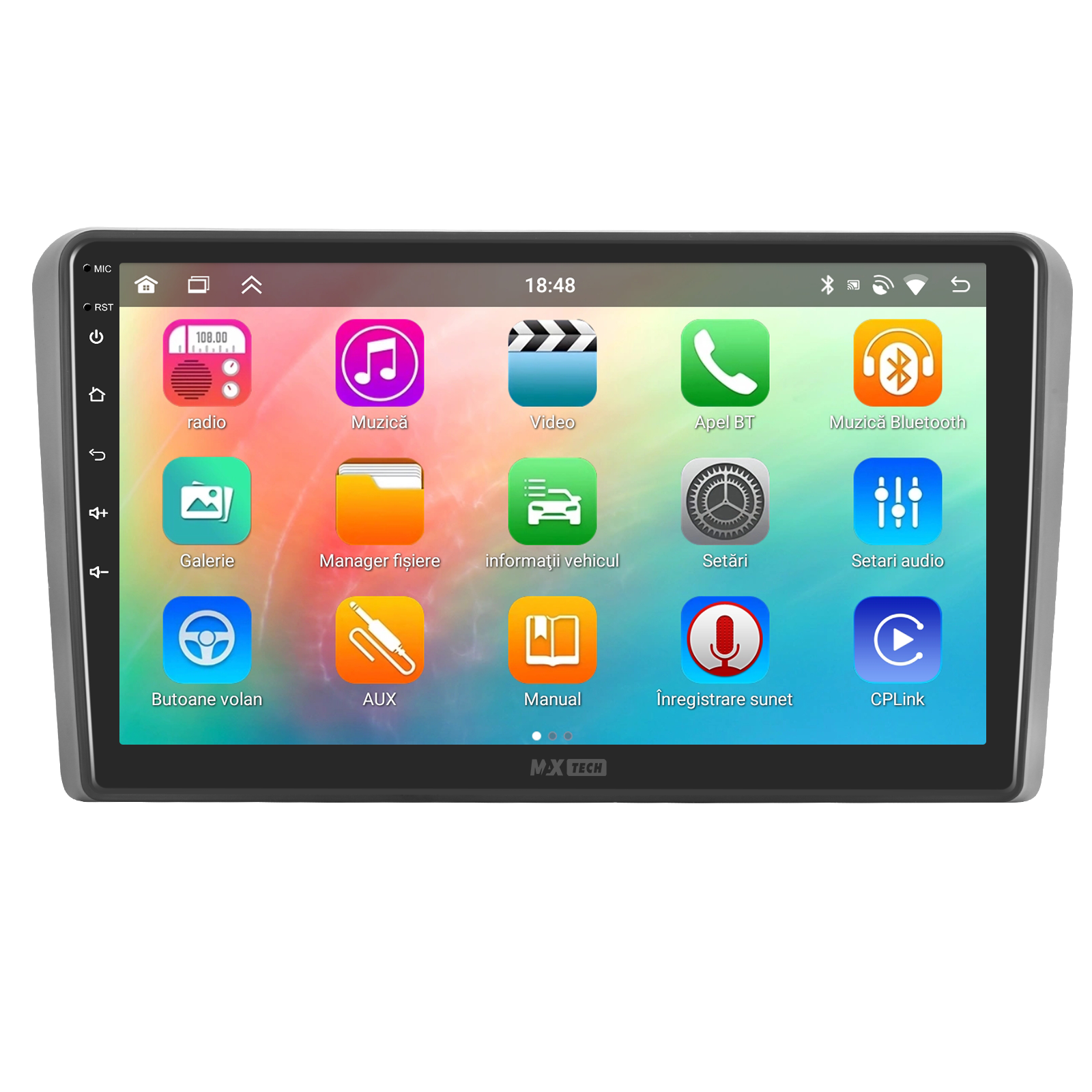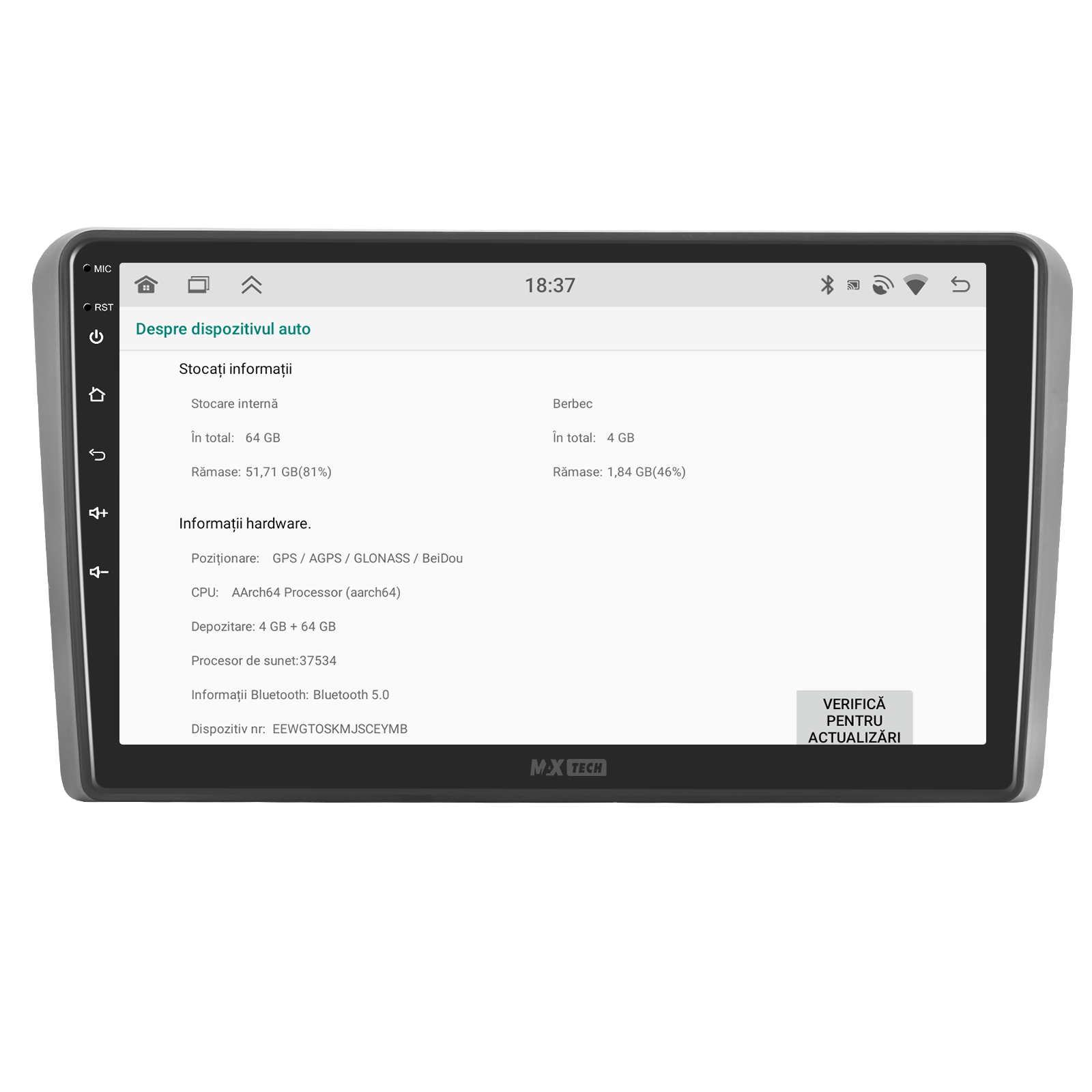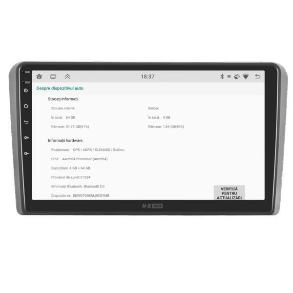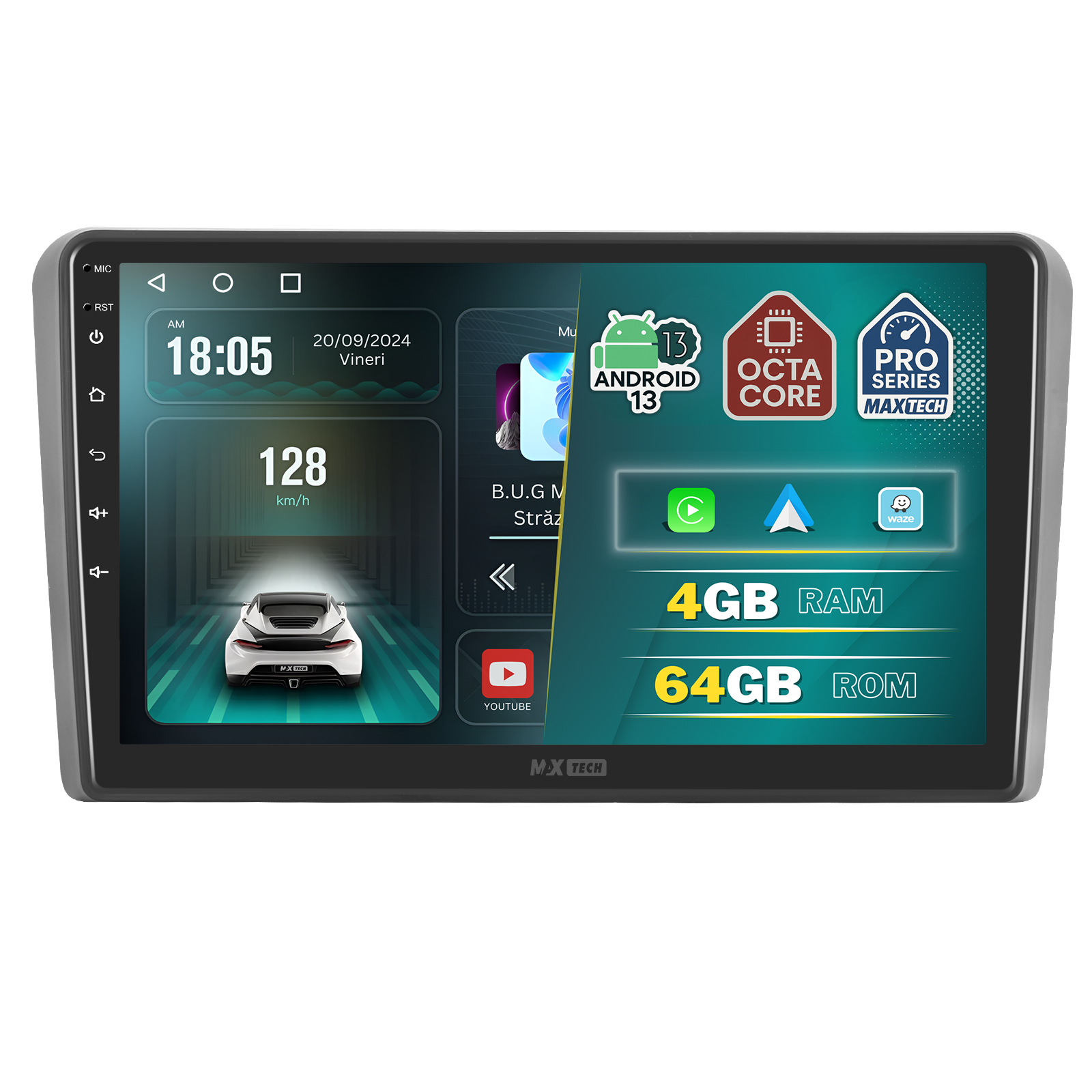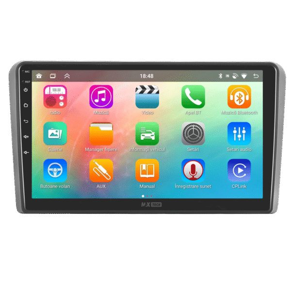 Sistemul MaxTech ProSeries este echipat cu un procesor OctaCore de tip 4+4, 4 GB RAM si 64 GB stocare, pentru multitasking rapid. Ecranul IPS HD de 1280×720 ofera culori reale si vizibilitate excelenta din orice unghi, cu design modern 2.5D.