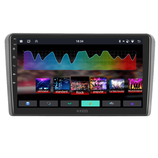 Sistemul include radio RDS cu afisare post si melodie, comutare automata pe frecventa cea mai buna si procesare audio DSP cu egalizator si filtru activ pentru sunet clar, echilibrat si personalizabil.