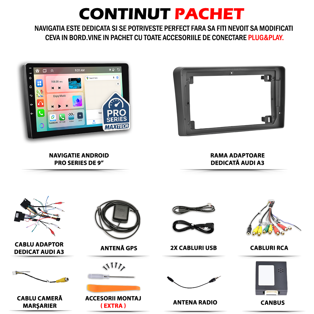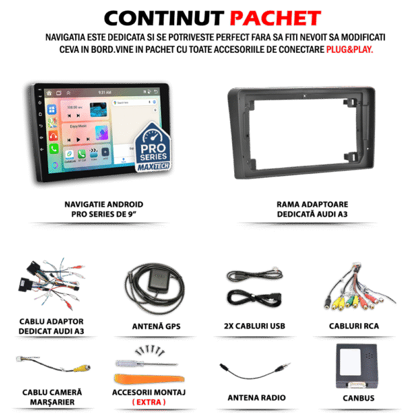 - Inainte de montaj, este esential ca toate componentele incluse in pachet sa fie verificate cu atentie. Conectorii trebuie sa corespunda cu cei ai vehiculului, iar eventualele module CANBUS, adaptoarele pentru comenzile de pe volan sau extensiile auxiliare (USB, RCA etc.) trebuie instalate conform specificatiilor tehnice.