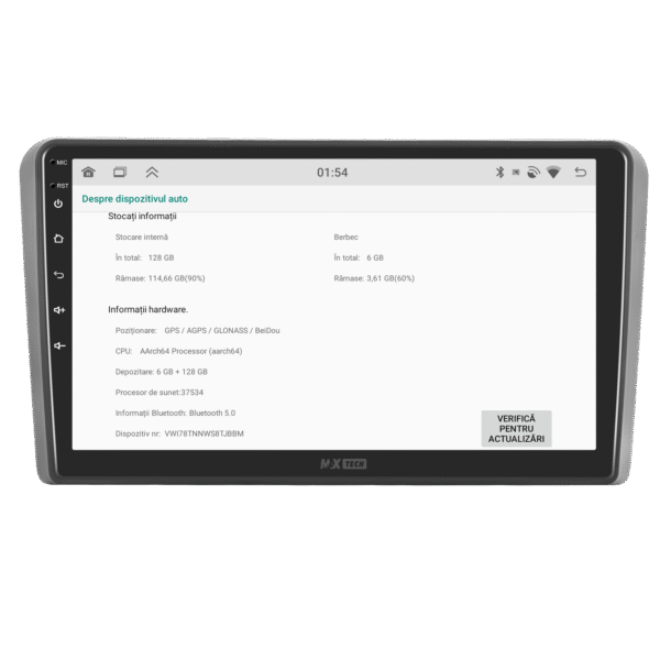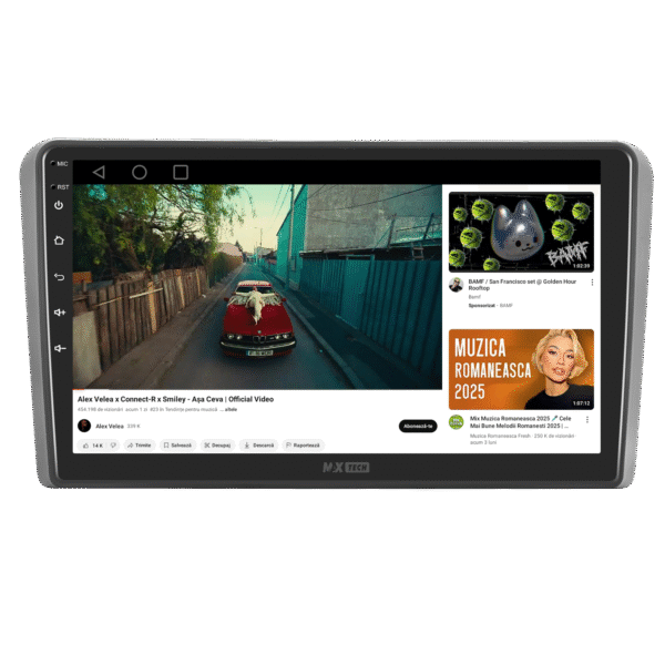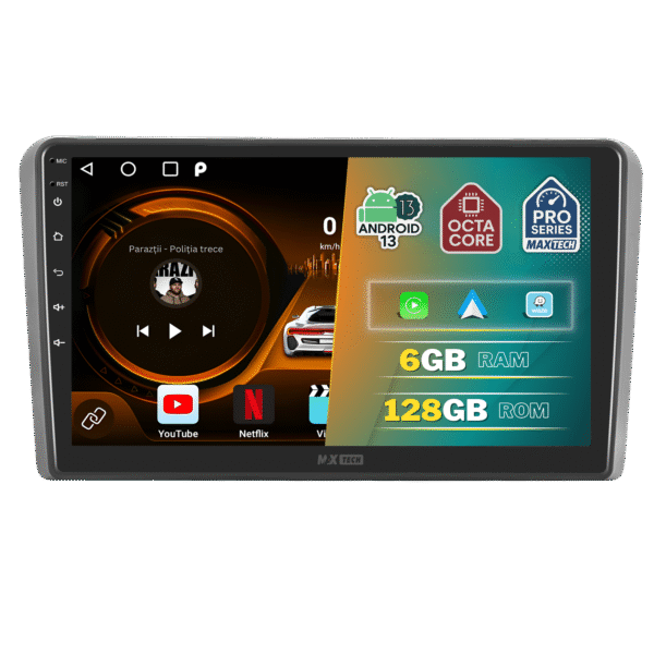 Sistemul MaxTech Pro Series este echipat cu un procesor OctaCore de tip 4+4, 6 GB RAM si 128 GB stocare, pentru multitasking rapid. Ecranul IPS HD de 1280×720 ofera culori reale si vizibilitate excelenta din orice unghi, cu design modern 2.5D.