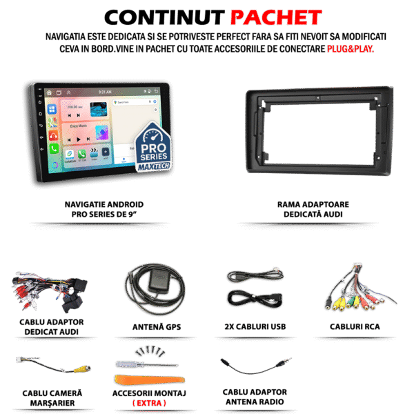 - Inainte de montaj, este esential ca toate componentele incluse in pachet sa fie verificate cu atentie. Conectorii trebuie sa corespunda cu cei ai vehiculului, iar eventualele module CANBUS, adaptoarele pentru comenzile de pe volan sau extensiile auxiliare (USB, RCA etc.) trebuie instalate conform specificatiilor tehnice.