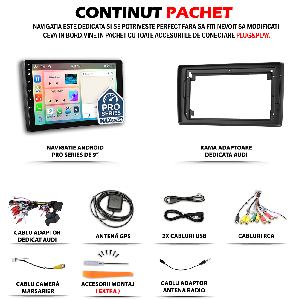 - Inainte de montaj, este esential ca toate componentele incluse in pachet sa fie verificate cu atentie. Conectorii trebuie sa corespunda cu cei ai vehiculului, iar eventualele module CANBUS, adaptoarele pentru comenzile de pe volan sau extensiile auxiliare (USB, RCA etc.) trebuie instalate conform specificatiilor tehnice.
