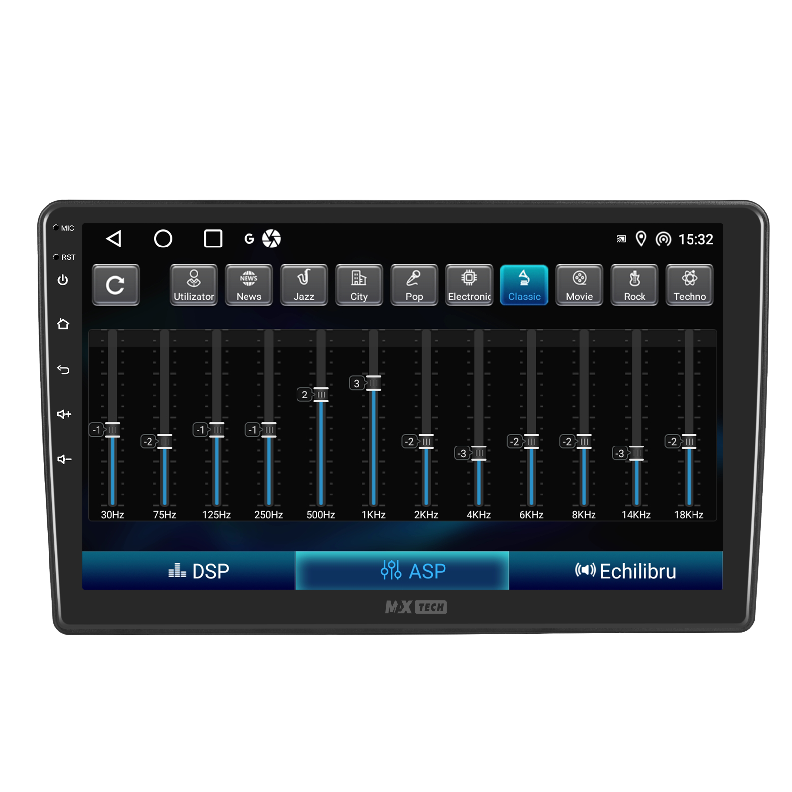 Sistemul include radio RDS cu afisare post si melodie, comutare automata pe frecventa cea mai buna si procesare audio DSP cu egalizator si filtru activ pentru sunet clar, echilibrat si personalizabil.