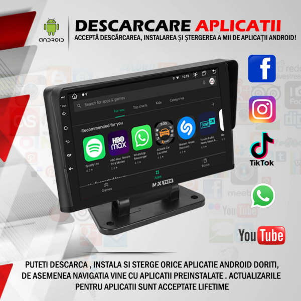 - YouTube: Acces la platforma YouTube pentru a viziona videoclipuri, muzica sau orice alt continut direct pe ecranul navigatiei.