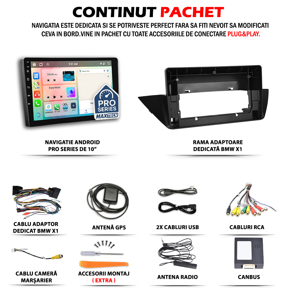Navigatie BMW X1 E84 (2009-2016) dedicata, MaxTech® PRO SERIES, 2 GB Ram 32 GB Rom, Carplay & Android auto, Ecran 10” HD Touch, GPS, Wifi, Bluetooth, Radio, USB, EQ, DSP, Waze, Youtube
