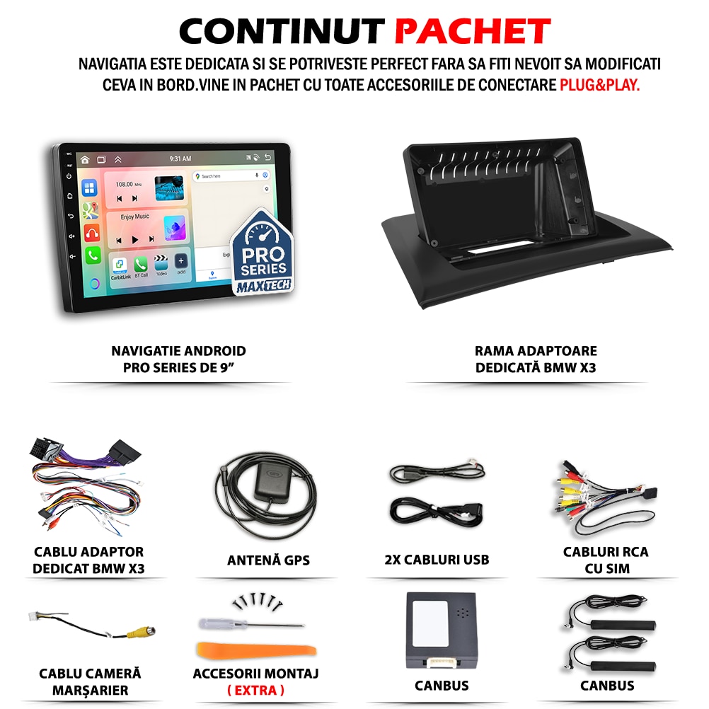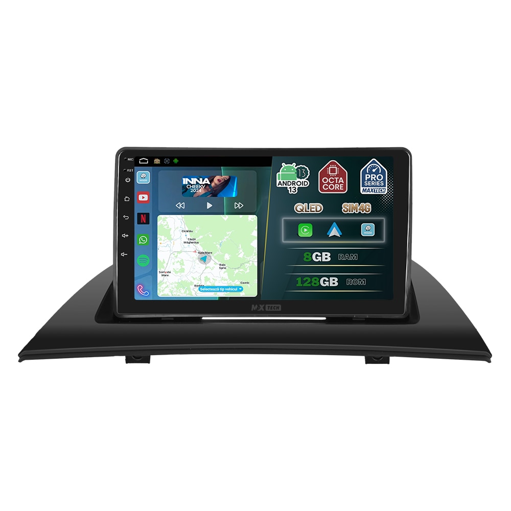 Navigatie BMW X3 E83 2004-2010 dedicata, MaxTech® PRO SERIES, 8 GB Ram 128 GB Rom OctaCore, Carplay & Android auto, Ecran 9” HD Touch, SIM 4G, GPS, Wifi, Bluetooth, Radio, EQ, Waze, Youtube