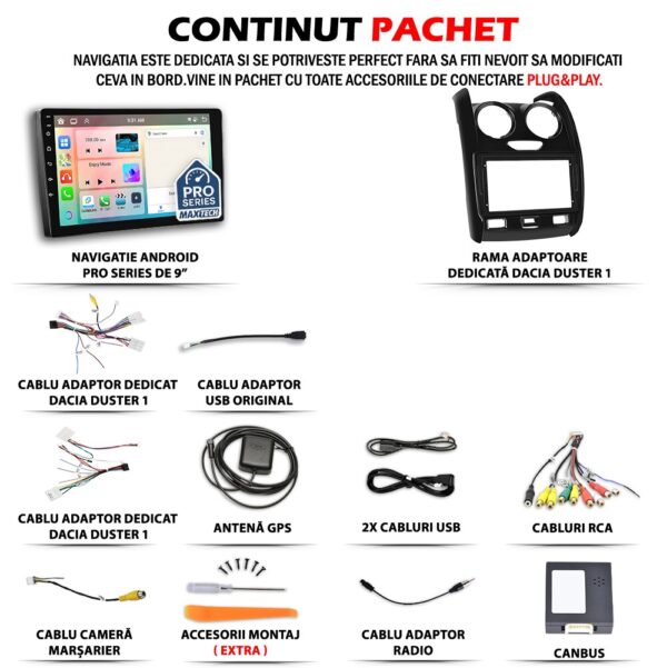Navigatie Dacia Duster 1 2013-2017 dedicata, MaxTech® PRO SERIES, 2 GB Ram 32 GB Rom, Carplay & Android auto, Ecran 9 ” HD Touch, GPS, Wifi, Bluetooth, Radio, USB, EQ, DSP, Waze, Youtube