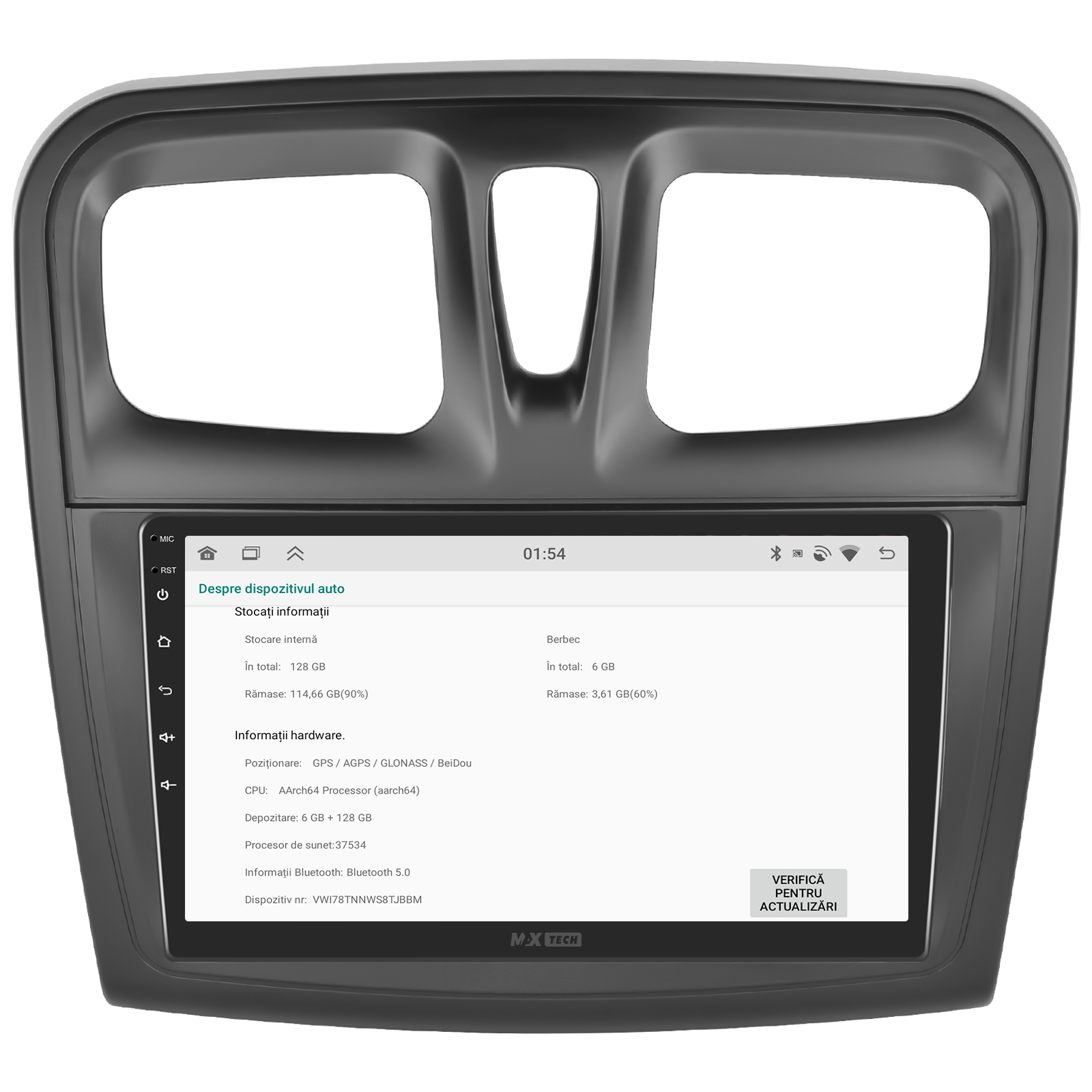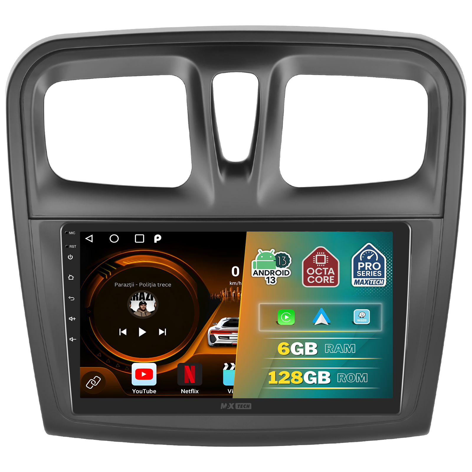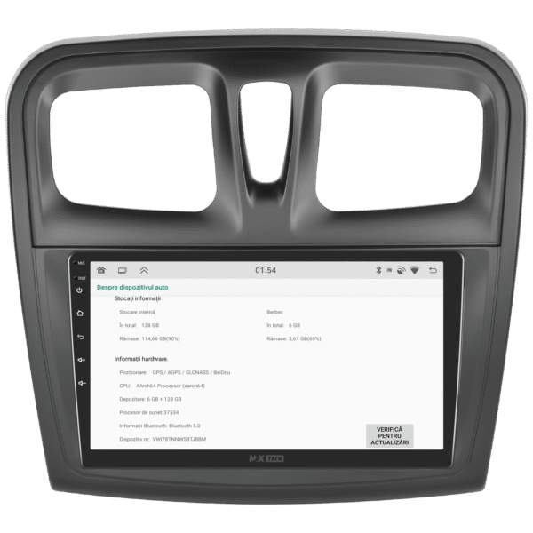 Sistemul MaxTech Pro Series este echipat cu un procesor OctaCore de tip 4+4, 6 GB RAM si 128 GB stocare, pentru multitasking rapid. Ecranul IPS HD de 1280×720 ofera culori reale si vizibilitate excelenta din orice unghi, cu design modern 2.5D.