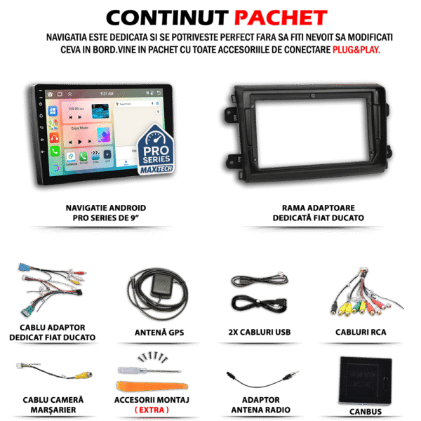 Navigatie Fiat Ducato 2015-2021 dedicata, MaxTech® PRO SERIES, 6 GB Ram 128 GB Rom OctaCore, Carplay & Android auto, Ecran 9” HD Touch, GPS, Wifi, Bluetooth, Radio, USB, EQ, DSP, Waze, Youtube