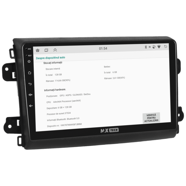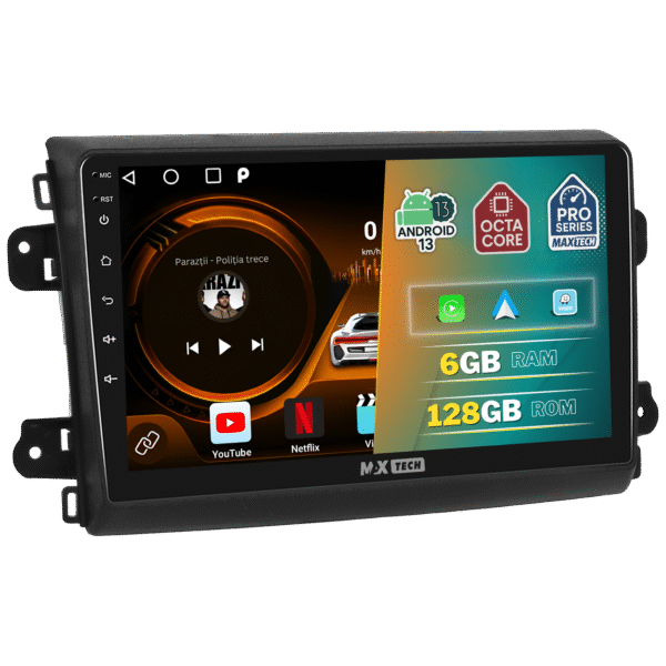 Sistemul MaxTech Pro Series este echipat cu un procesor OctaCore de tip 4+4, 6 GB RAM si 128 GB stocare, pentru multitasking rapid. Ecranul IPS HD de 1280×720 ofera culori reale si vizibilitate excelenta din orice unghi, cu design modern 2.5D.