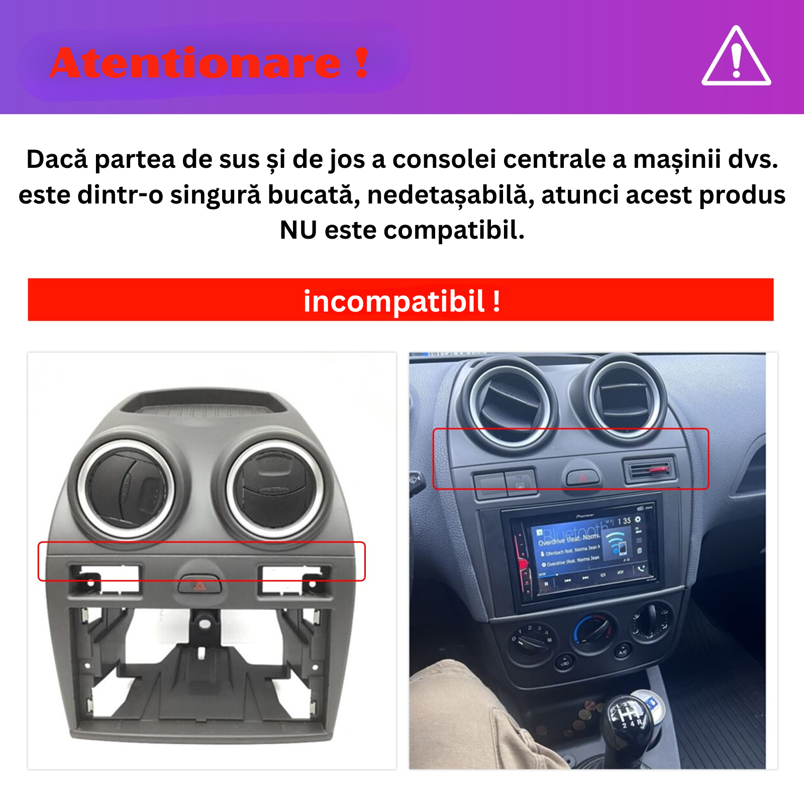 - Desi aceste sisteme sunt concepute pentru instalare de tip „Plug & Play”, in cazuri exceptionale, particularitatile specifice fiecarui model auto pot impune o atentie suplimentara in ceea ce priveste conectica si integrarea cu sistemele originale ale vehicululu . ( Daca este cazul, anumite atentionari vor fi evidentiate in imaginile produsului.)