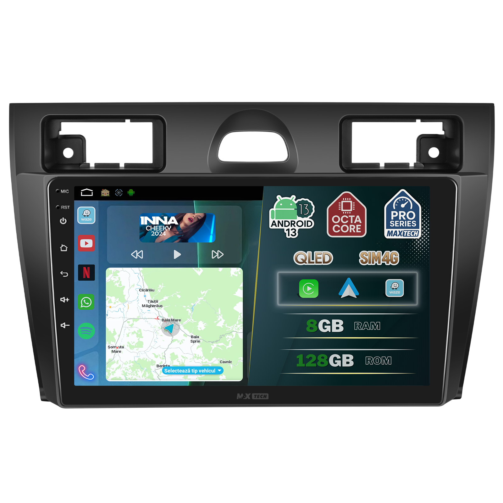 Navigatie Ford Fiesta 2002-2008 dedicata, MaxTech® PRO SERIES, 8 GB Ram 128 GB Rom OctaCore, Carplay & Android auto, Ecran 9” HD Touch, SIM 4G, GPS, Wifi, Bluetooth, Radio, EQ, Waze, Youtube