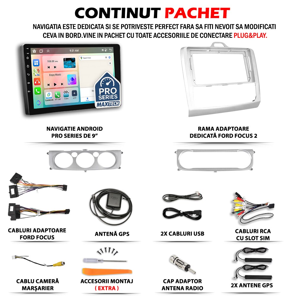 Navigatie Ford Focus 2 2004-2011 dedicata, MaxTech® PRO SERIES, 8 GB Ram 128 GB Rom OctaCore, Carplay & Android auto, Ecran 9” HD Touch, SIM 4G, GPS, Wifi, Bluetooth, Radio, EQ, Waze, Youtube