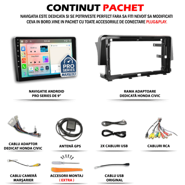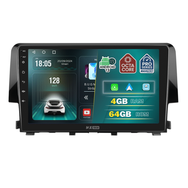 Navigatie Honda Civic 2017-2021 dedicata, MaxTech® PRO SERIES, 4 GB Ram 64 GB Rom OctaCore, Carplay & Android auto, Ecran 9 ” HD Touch, GPS, Wifi, Bluetooth, Radio, USB, EQ, DSP, Waze
