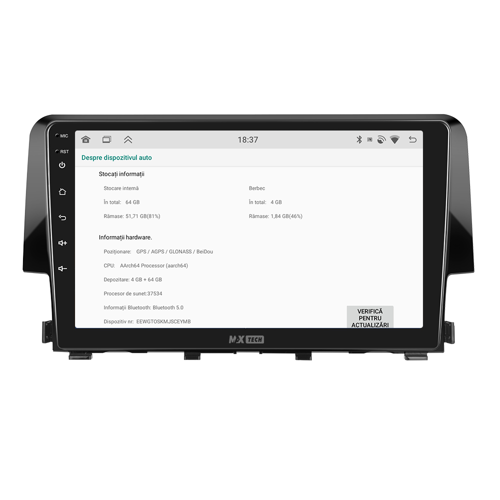 Sistemul MaxTech ProSeries este echipat cu un procesor OctaCore de tip 4+4, 4 GB RAM si 64 GB stocare, pentru multitasking rapid. Ecranul IPS HD de 1280×720 ofera culori reale si vizibilitate excelenta din orice unghi, cu design modern 2.5D.