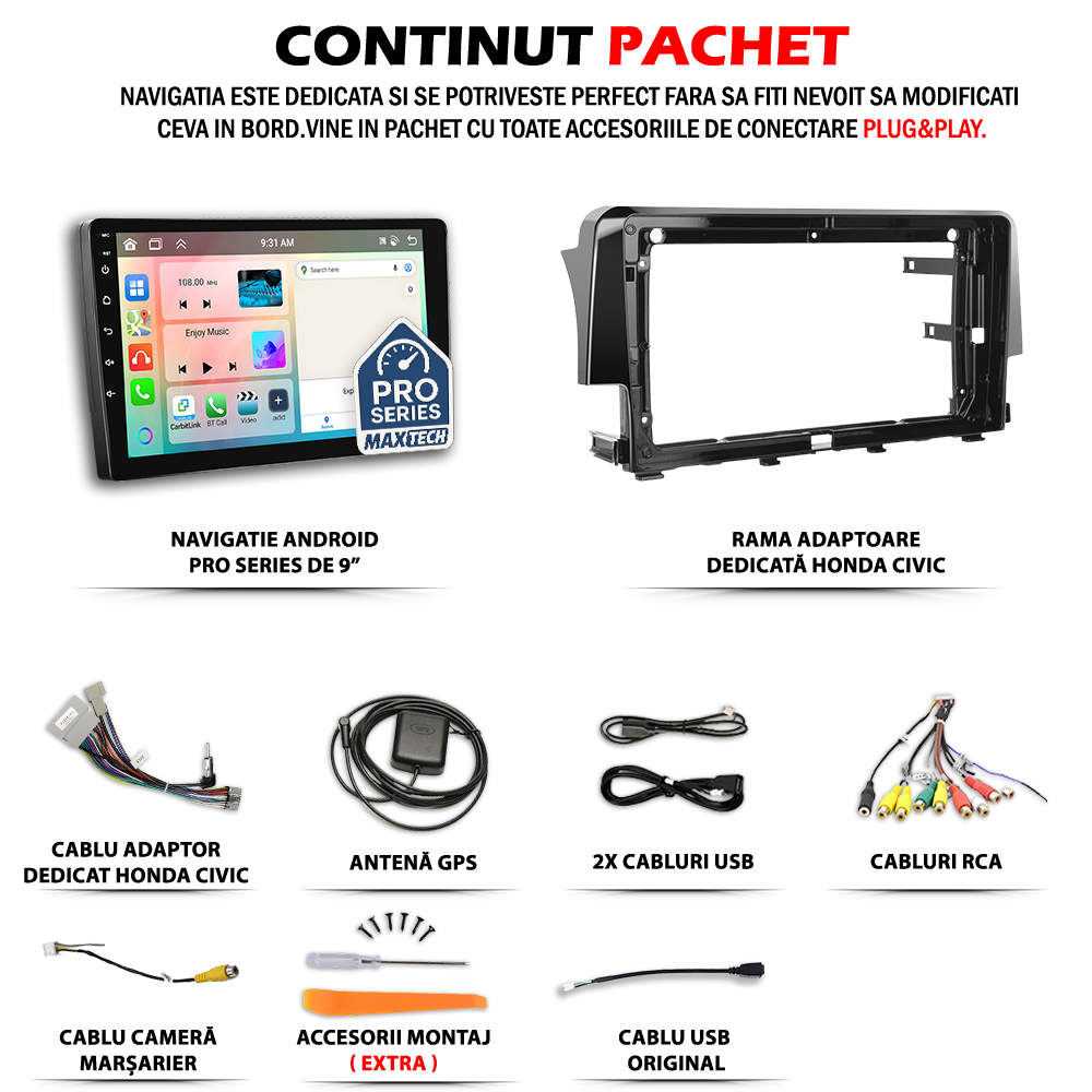 Navigatie Honda Civic 2017-2021 dedicata, MaxTech® PRO SERIES, 4 GB Ram 64 GB Rom OctaCore, Carplay & Android auto, Ecran 9 ” HD Touch, GPS, Wifi, Bluetooth, Radio, USB, EQ, DSP, Waze