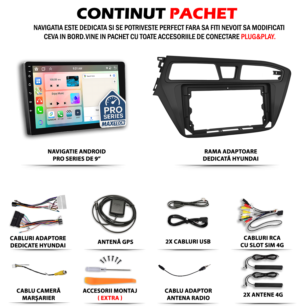 Navigatie Hyundai I20 2015-2017 dedicata, MaxTech® PRO SERIES, 8 GB Ram 128 GB Rom OctaCore, Carplay & Android auto, Ecran 9” HD Touch, SIM 4G, GPS, Wifi, Bluetooth, Radio, EQ, Waze, Youtube