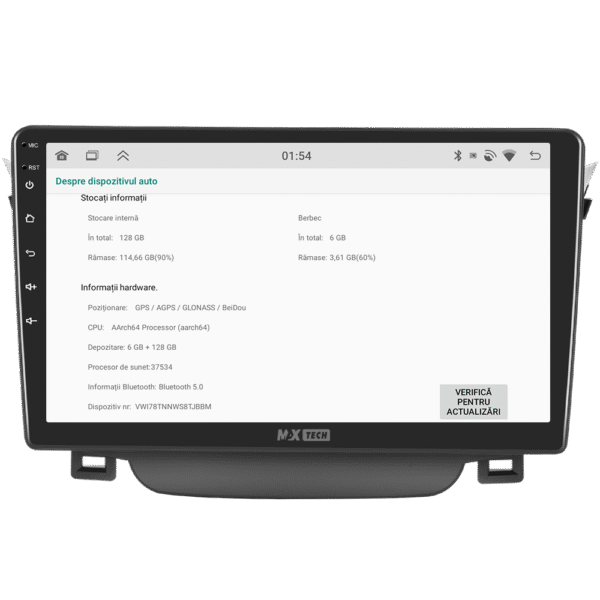 Sistemul MaxTech Pro Series este echipat cu un procesor OctaCore de tip 4+4, 6 GB RAM si 128 GB stocare, pentru multitasking rapid. Ecranul IPS HD de 1280×720 ofera culori reale si vizibilitate excelenta din orice unghi, cu design modern 2.5D.