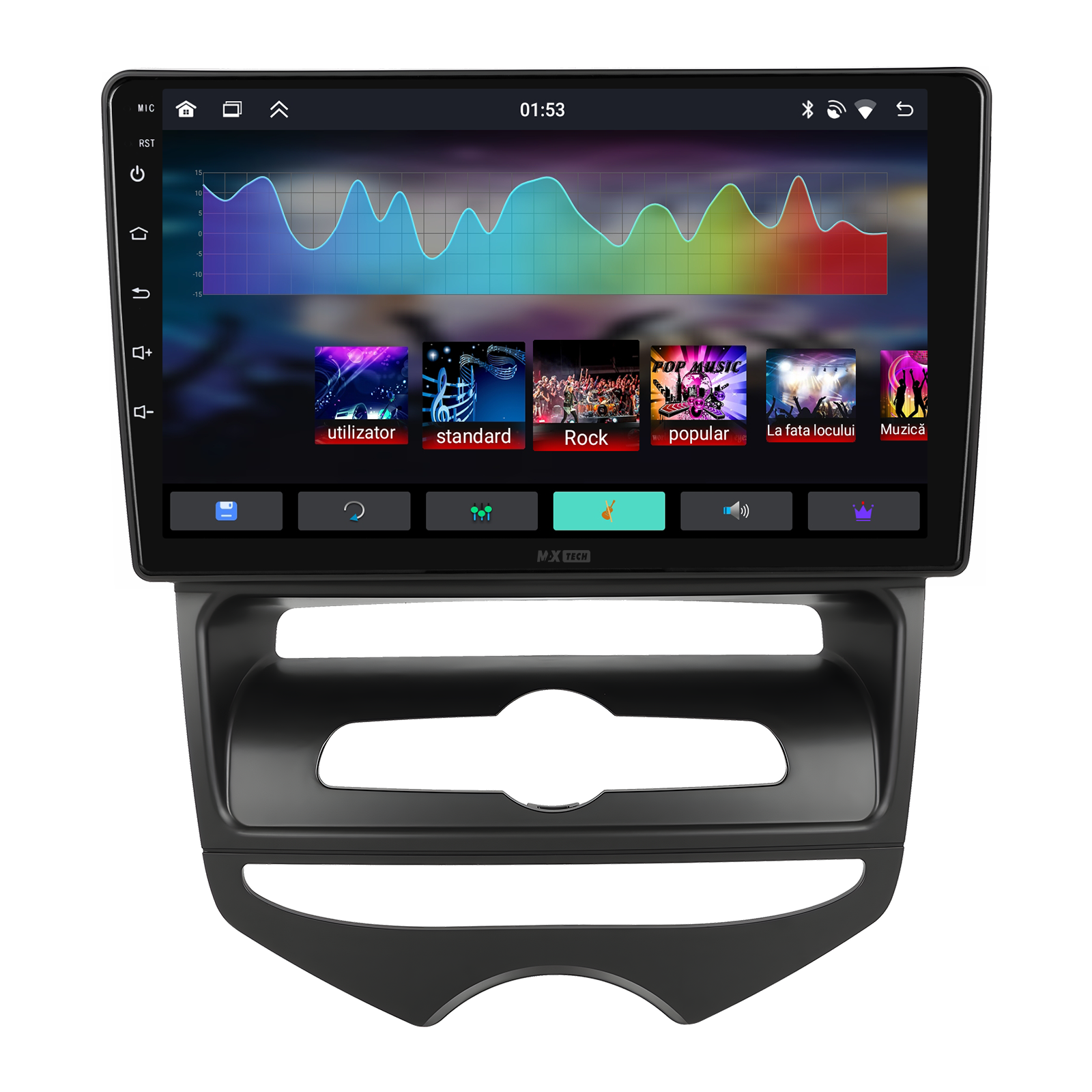 Sistemul include radio RDS cu afisare post si melodie, comutare automata pe frecventa cea mai buna si procesare audio DSP cu egalizator si filtru activ pentru sunet clar, echilibrat si personalizabil.