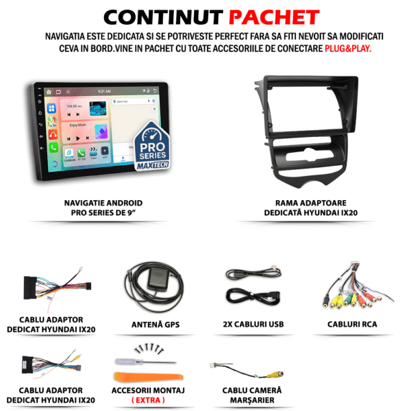 Navigatie Hyundai IX20 2010-2019 AC Manual dedicata, MaxTech® PRO SERIES, 6 GB Ram 128 GB Rom OctaCore, Carplay & Android auto, Ecran 9” HD Touch, GPS, Wifi, Bluetooth, Radio, USB, EQ, DSP, Waze