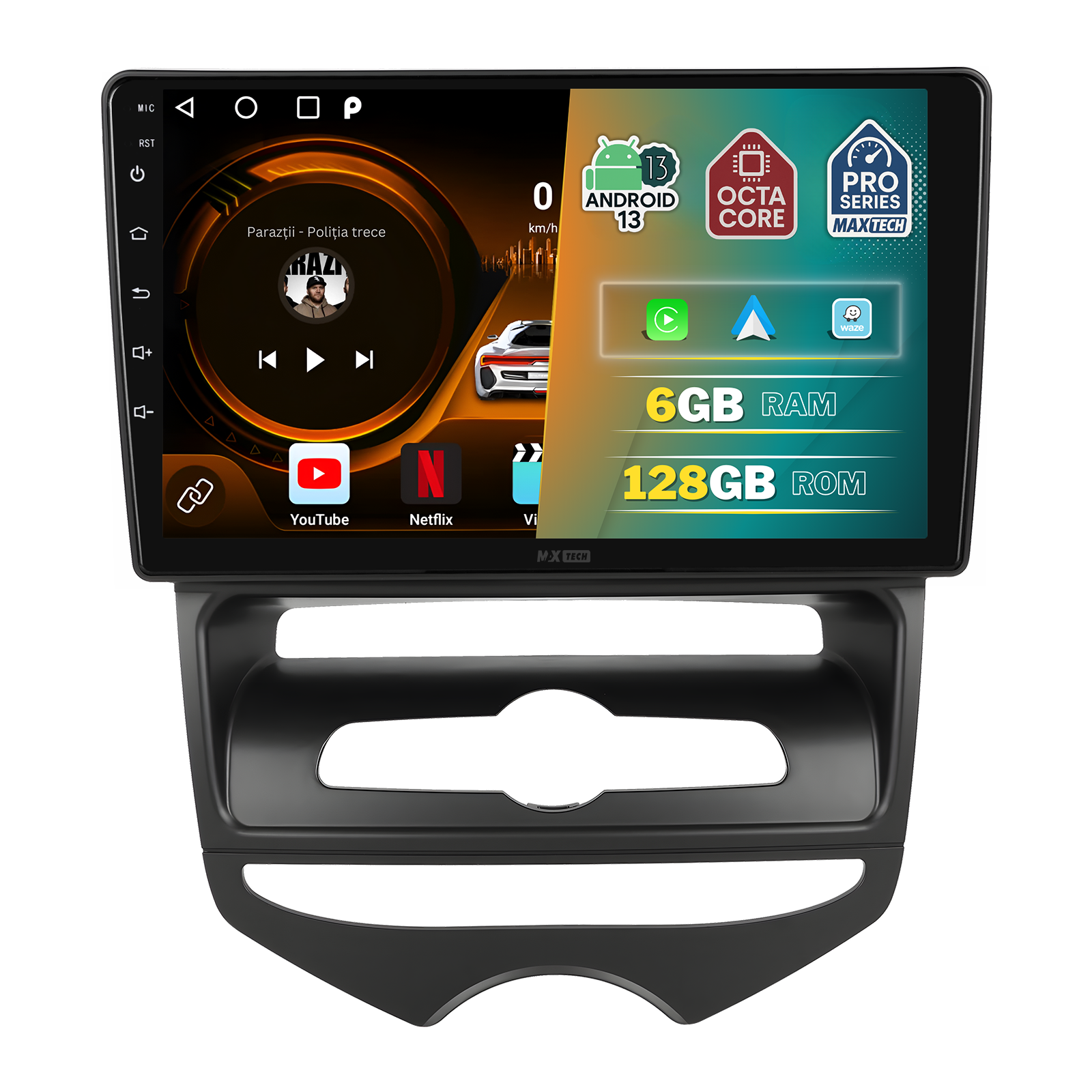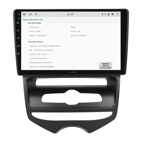 Sistemul MaxTech Pro Series este echipat cu un procesor OctaCore de tip 4+4, 6 GB RAM si 128 GB stocare, pentru multitasking rapid. Ecranul IPS HD de 1280×720 ofera culori reale si vizibilitate excelenta din orice unghi, cu design modern 2.5D.